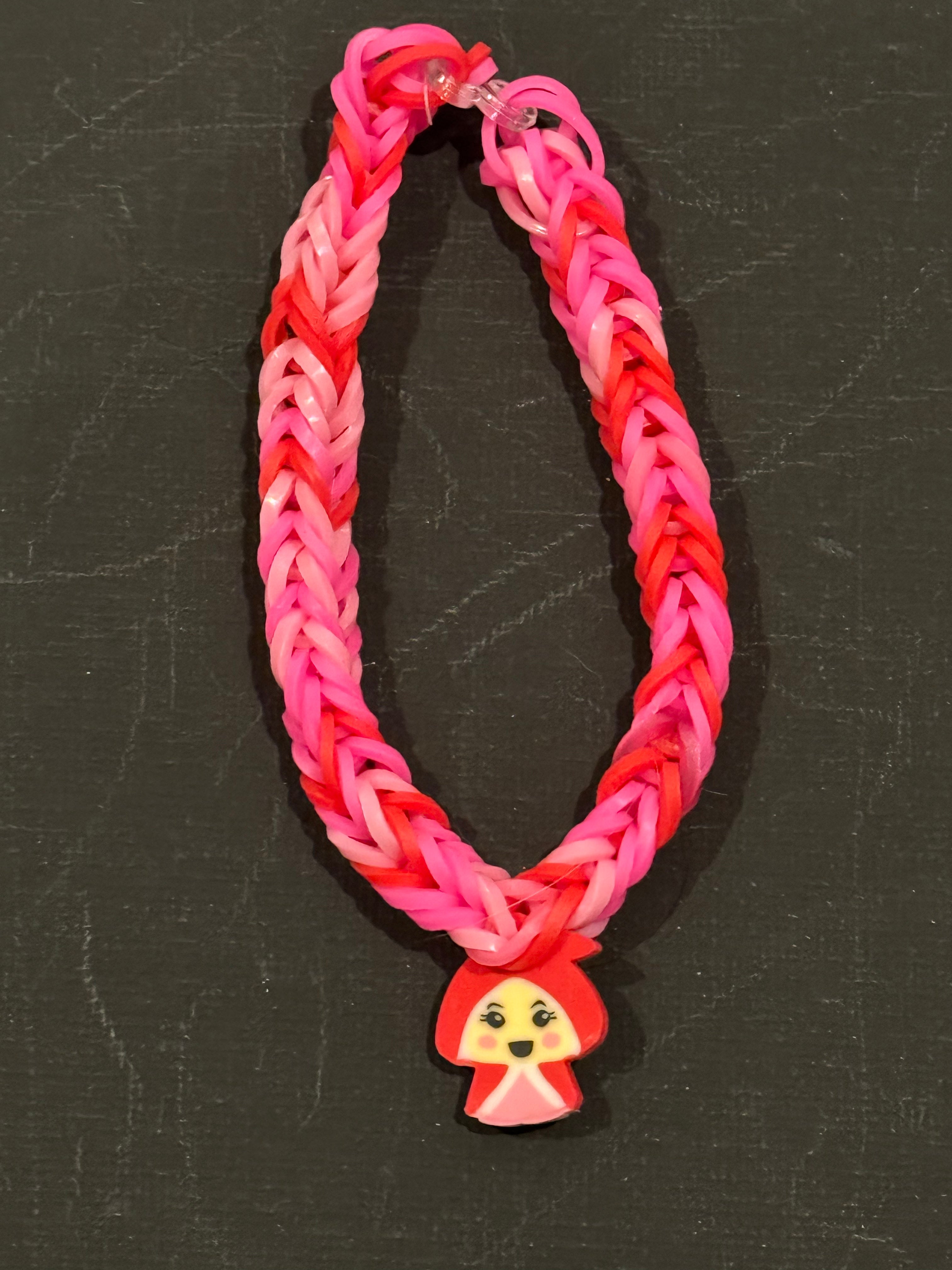 Pink and red rubber band bracelet with charm