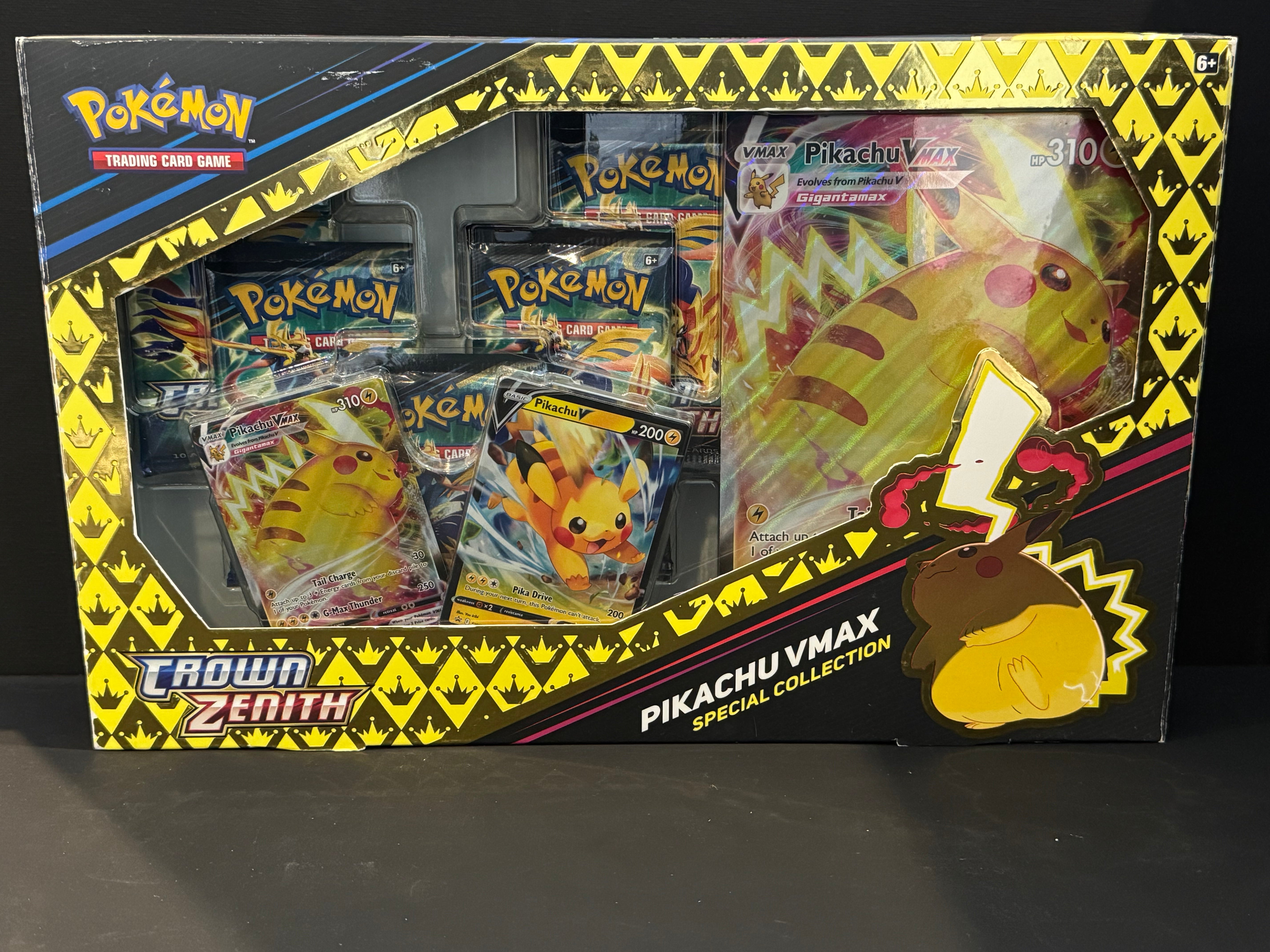 Pokemon Crown Zenith Pikachu VMax Special Collection Box Set. Includes 5 booster packs, 1 etched promo card, 1 oversized promo card and 1 foil promo card.