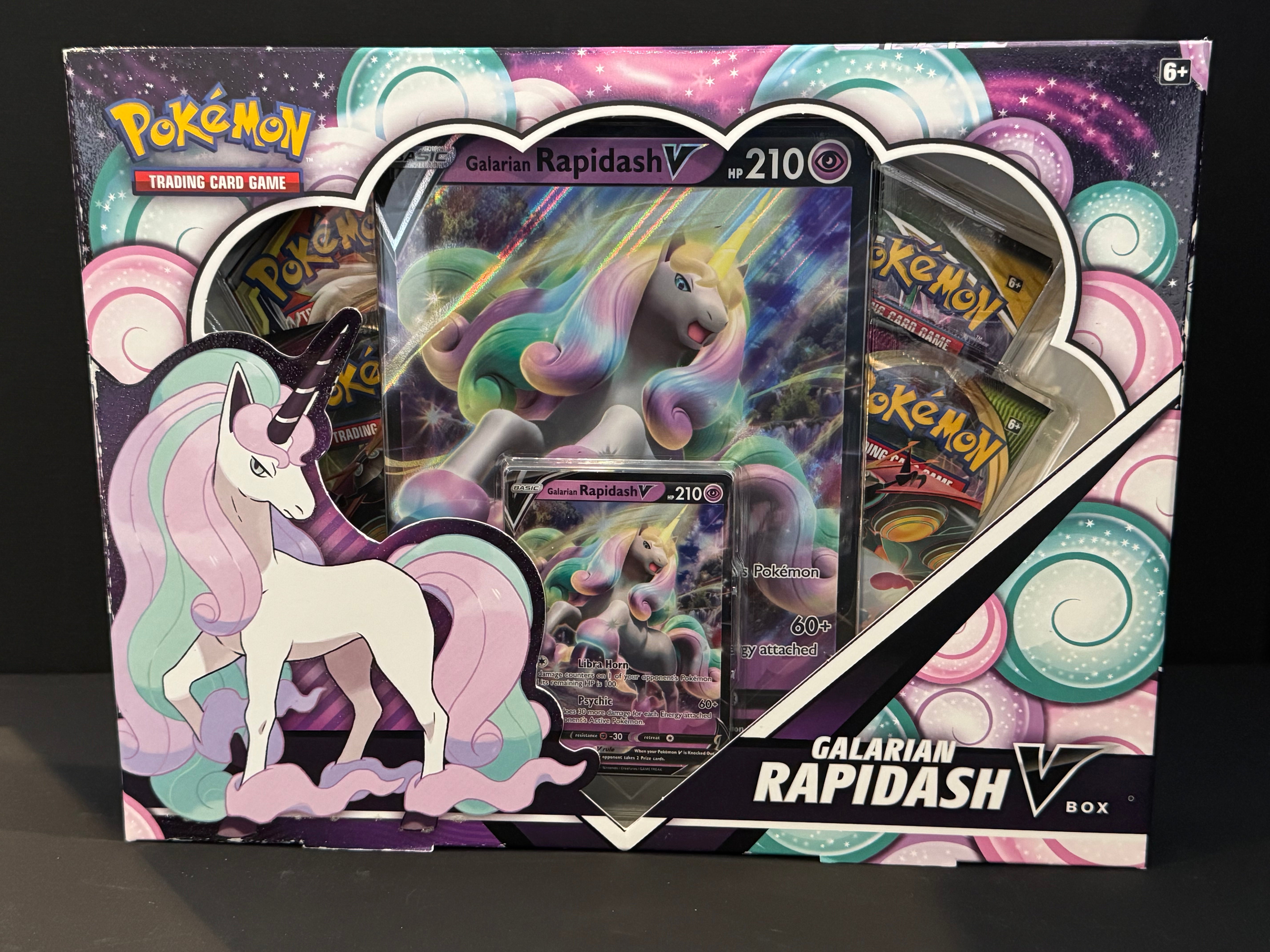 Pokemon Galarian Rapidash V Box Set. Includes 4 booster packs, 1 Galarian Rapidash V promo card, 1 oversized foil card.