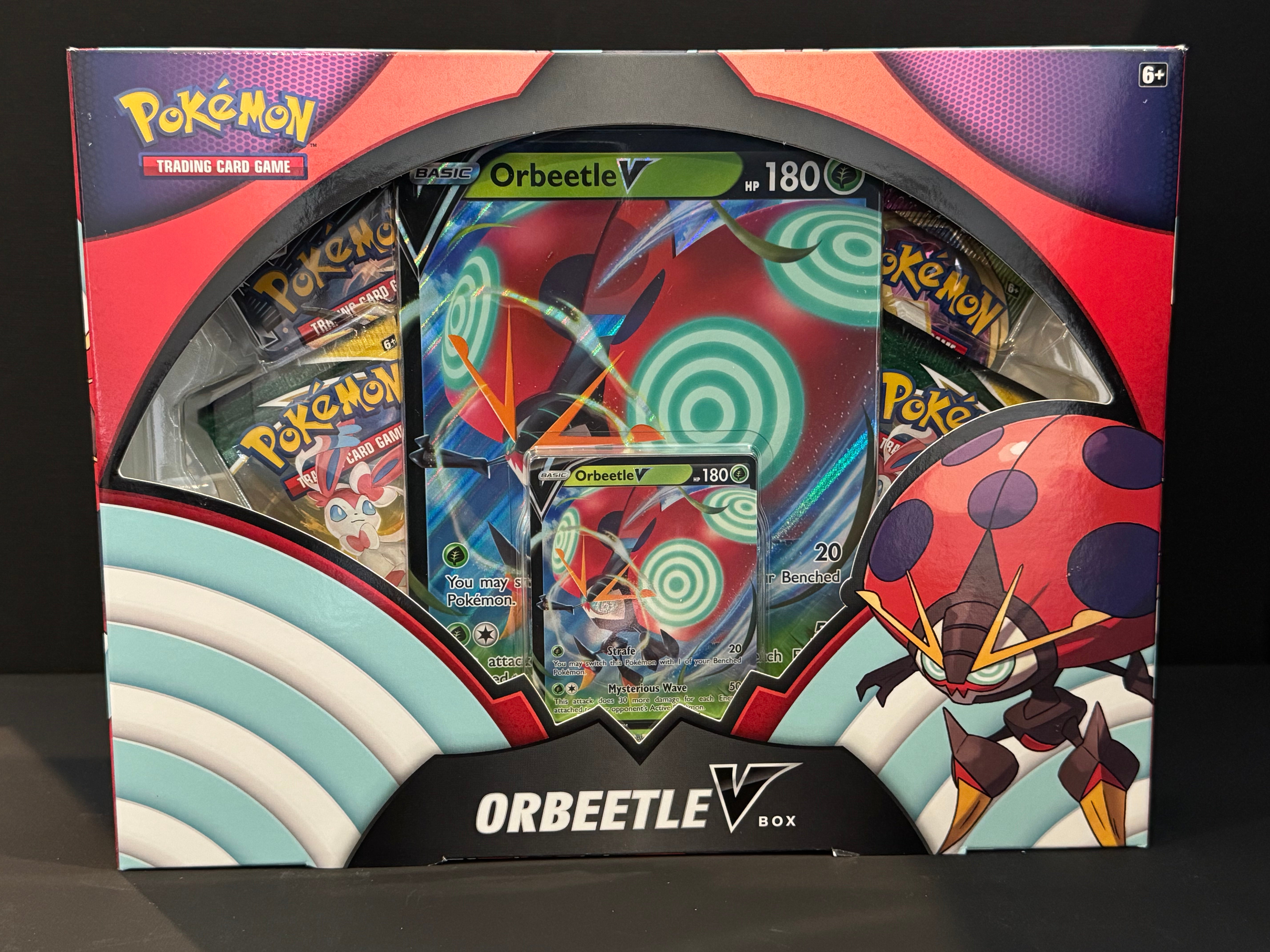 Pokemon Orbeetle V Box Set. Includes 4 booster packs, 1 promo card and 1 oversized foil card.